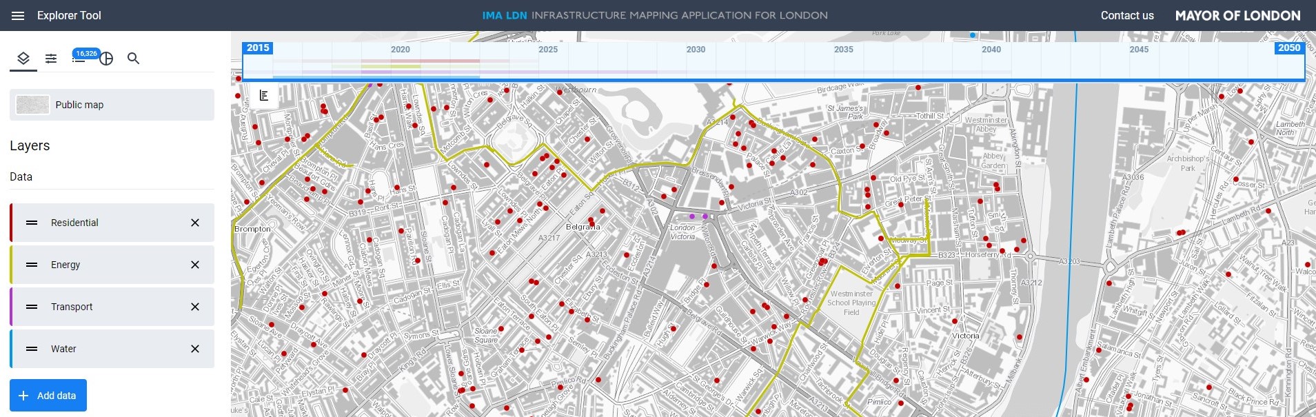 The Infrastructure Map is an interactive tool which lets users explore current and future development and infrastructure projects in London. It gives boroughs and developers a clear picture of what developments are taking place, so that they can better plan for new housing and other changes. Heart of the System is a database of current developments and future infrastructure investments (from 2015 to 2050) by public and private sectors, which is exposed via secure map services and queryable via user interface. Secure data sharing processes between key partners which includes Barbour ABI, Cadent, EA, National Grid, SGN, Thames Water, TfL, UK Power Networks and all London Boroughs.