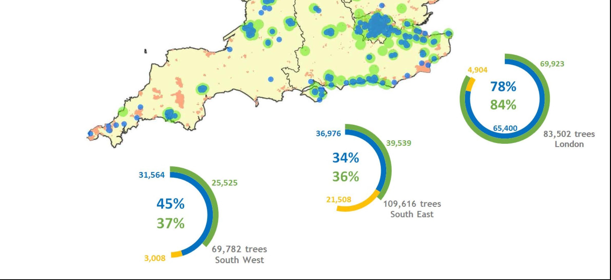 The The Big Tree Plant project ran between 2012-2015 and helped plant over 143,000 trees all around England. Using the field data collected, demographic data and other spatial data, Groundwork GDS played a big role in communicating project results by developing maps which showed the percentages of trees planted in areas lacking green spaces and in areas of greatest need (based on Index of Multiple Deprivation statistics). The maps and statistics provided were critical in assessing the value of the The Big Tree Plant project and is an example of the added benefit of spatial information for reporting purposes.